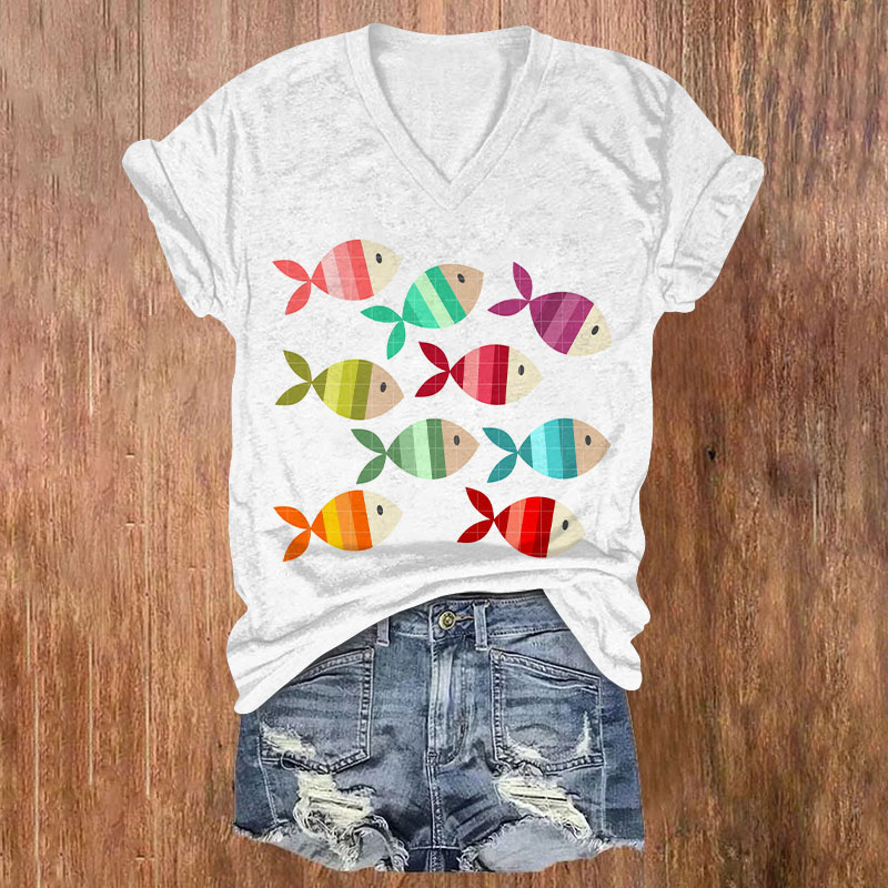 Simple Sea Fish Print V-neck T-shirt