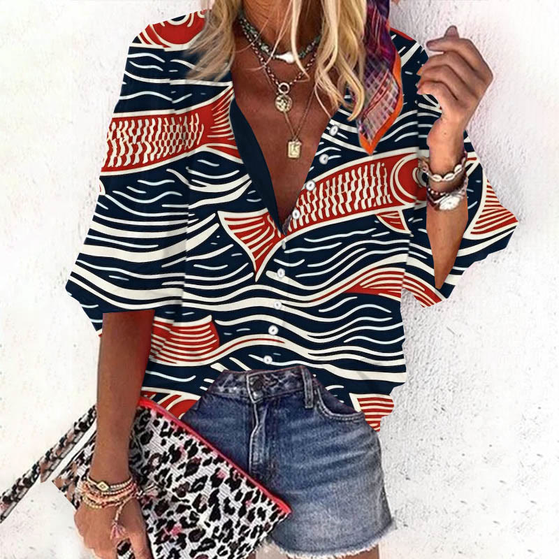 Dashingsoul Women's Funny Wavy Abstract Fish Art Print Casual 3/4 Sleeve Blouse