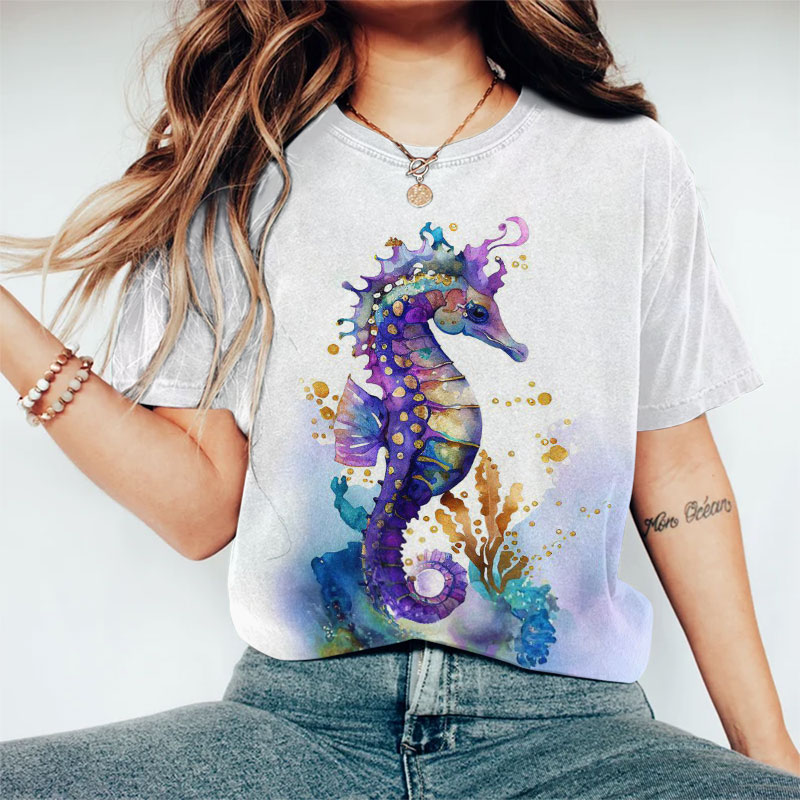 Dashingsoul Women's Watercolor Seahorse Art Print T-shirt