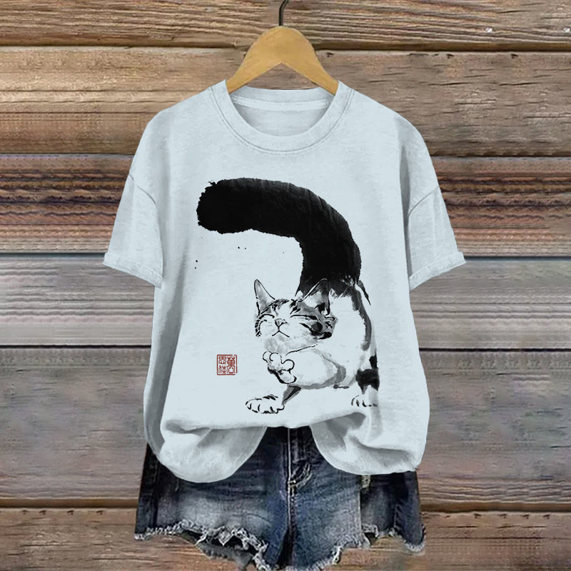 Dashingsoul Cotton Contented Cat Ink Art Print T-shirt