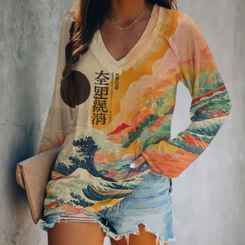 Dashingsoul Abstract Japanese Art Great Wave Vibrant Clouds Print V-neck Long Sleeve T-shirt