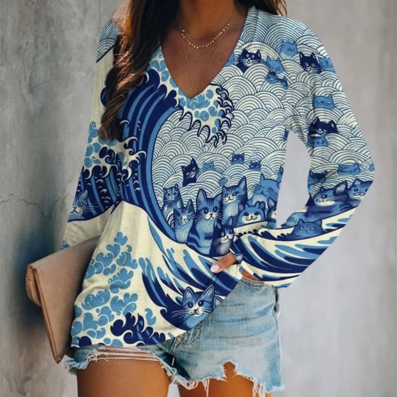 Dashingsoul Blue Waves And Cats Print V-neck Long Sleeve T-shirt