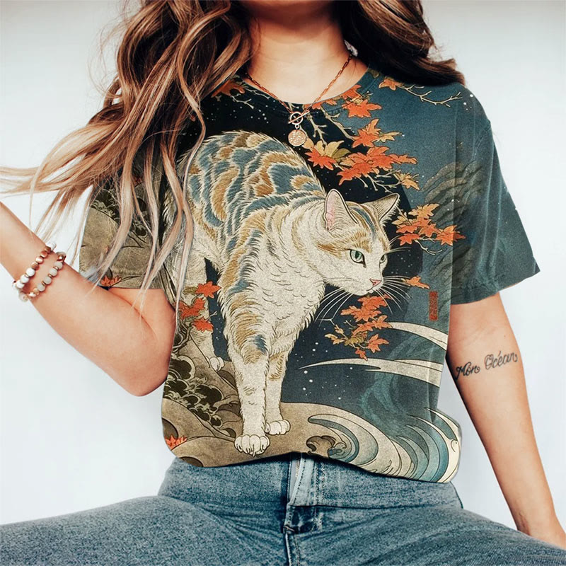 Dashingsoul Cat On Sea Waves Japanese Art Vintage Casual Women's Short Sleeve Crew Neck T-shirt