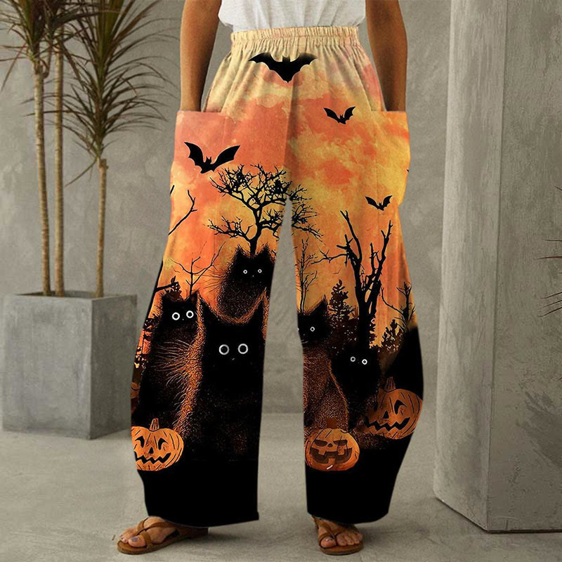 Dashingsoul Cats Halloween Pumpkin Print Casual Wide-leg Pants
