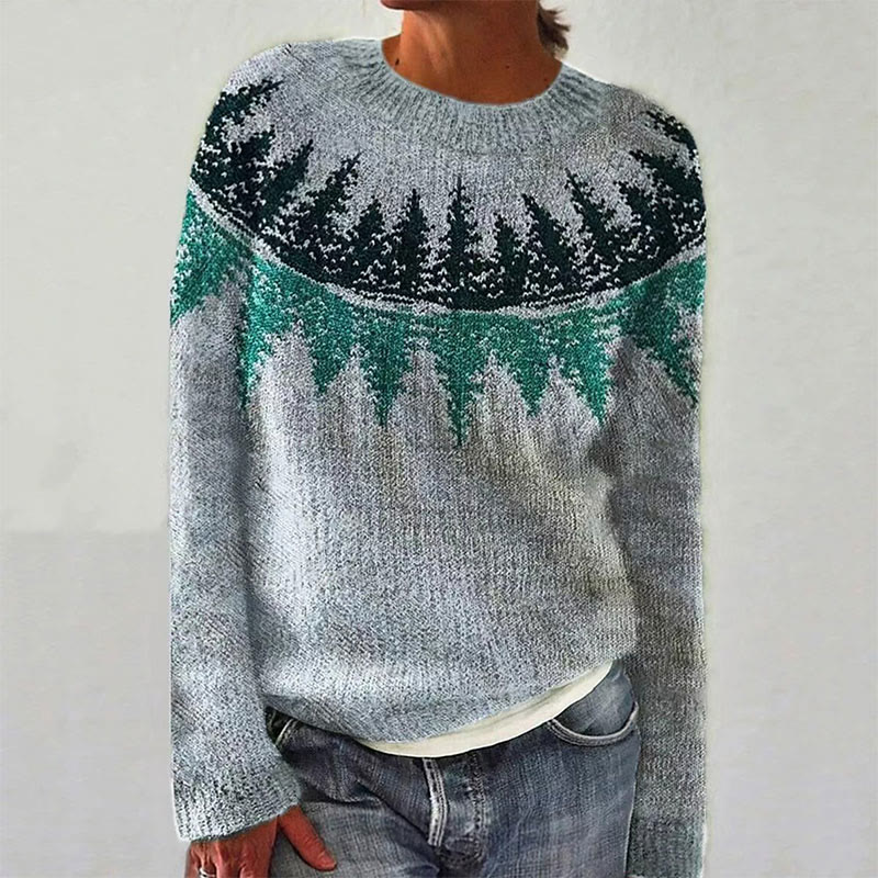 Color Block Forest Crew Neck Women's Casual Pullover Sweater