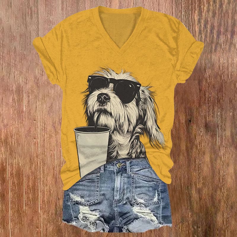Dashingsoul Cool Dog In Sunglasses And Coffee Print V-neck Short Sleeved T-shirt