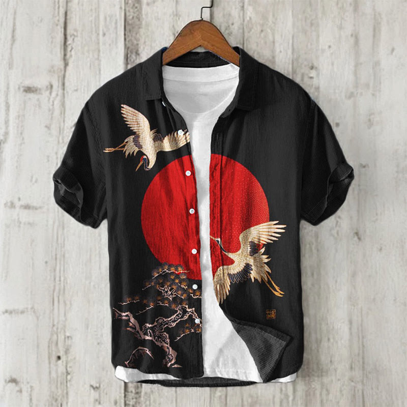 Dashingsoul Cranes & Pine Trees Sunrise Japanese Print Short Sleeve Shirt
