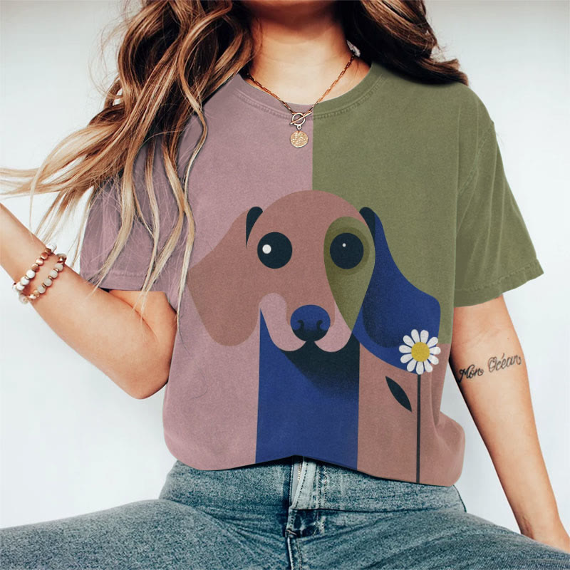Dashingsoul Creative Color Matching Art Dog Face Print Casual Women's Short Sleeve Crew Neck T-shirt