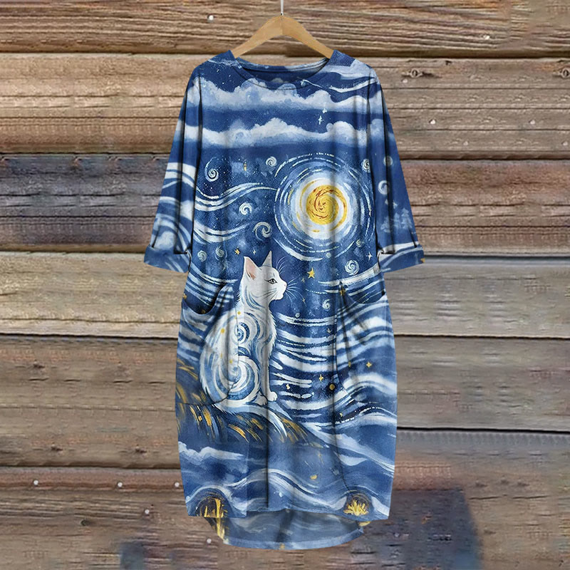 Dashingsoul Creative Starry Cat Print Crew Neck Casual Dress