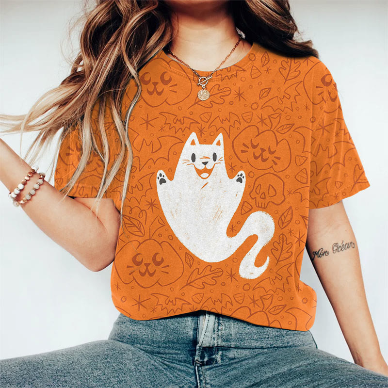 Dashingsoul Cute Ghost Cat Specter Print Short-sleeved T-shirt