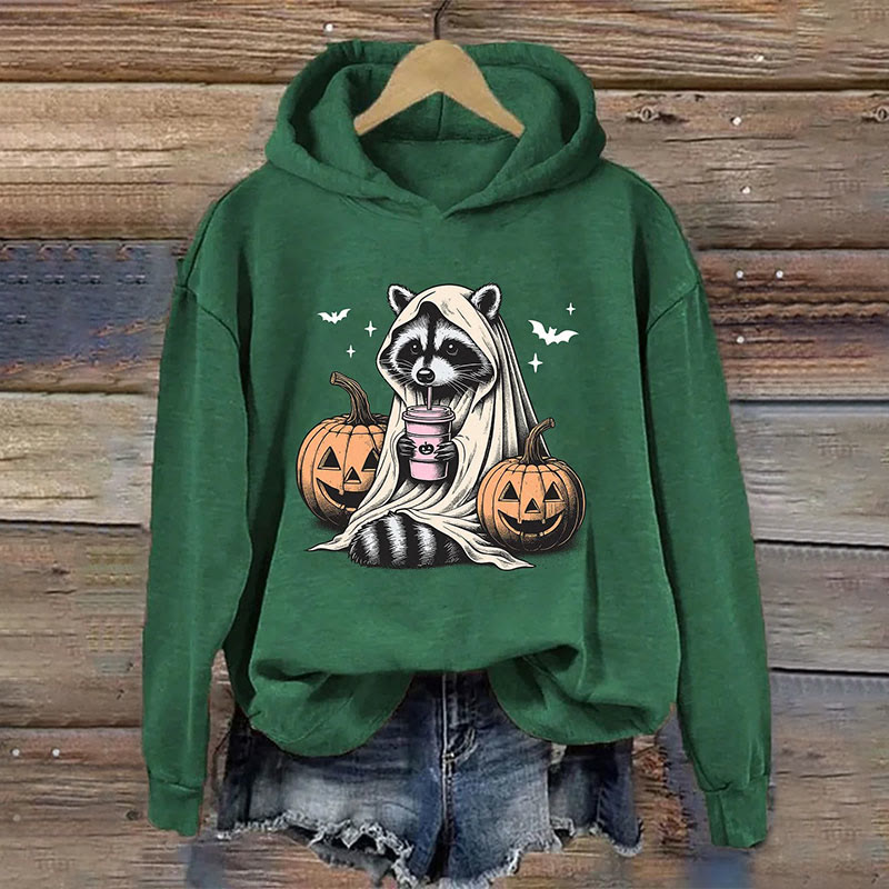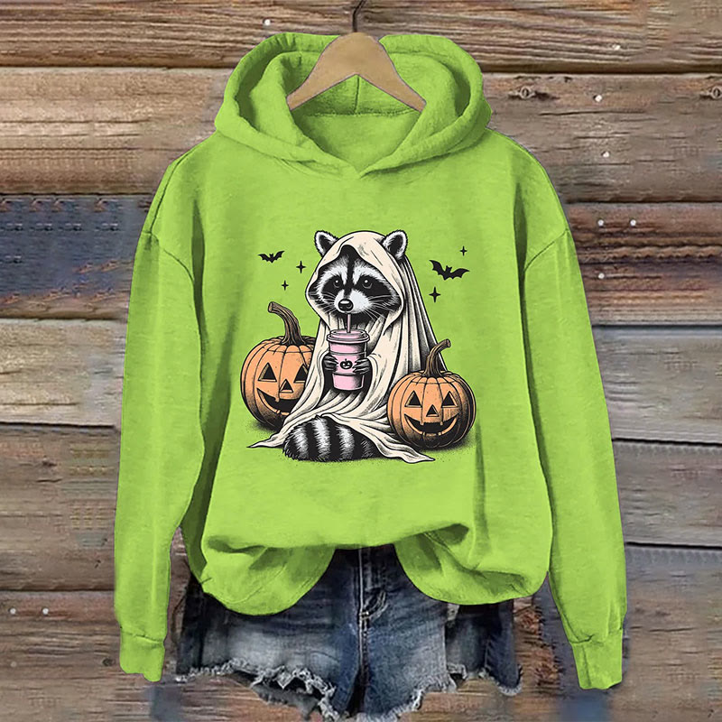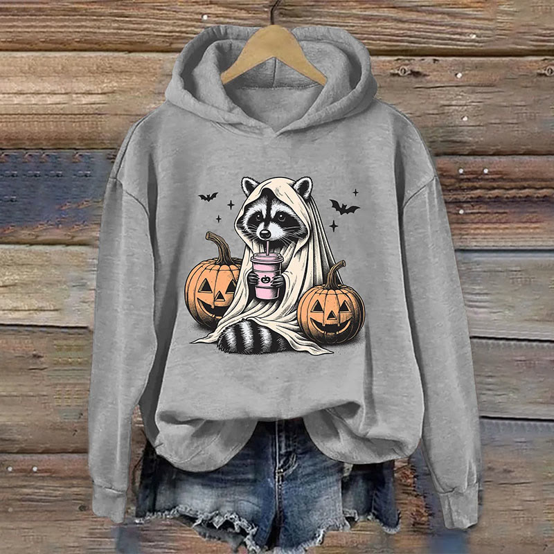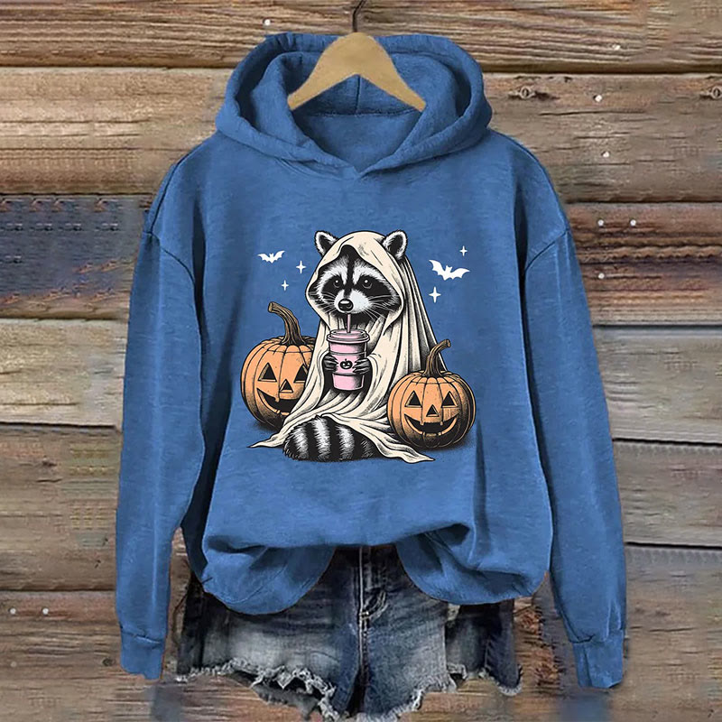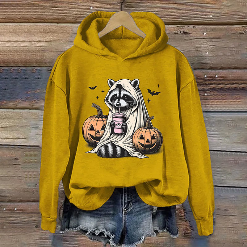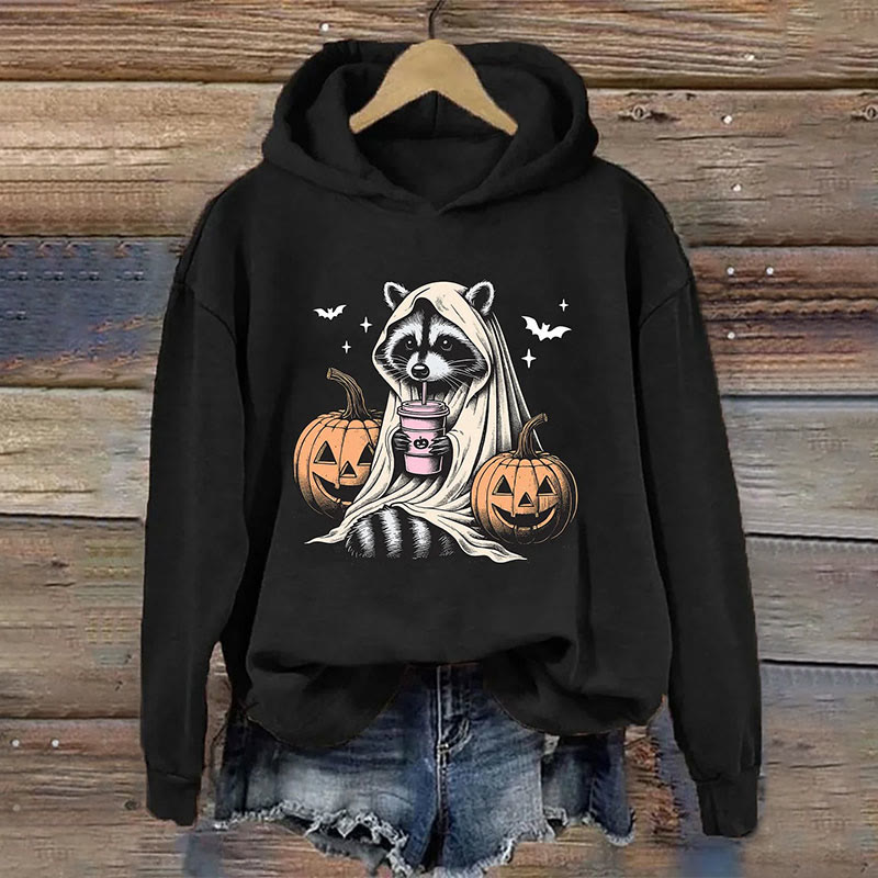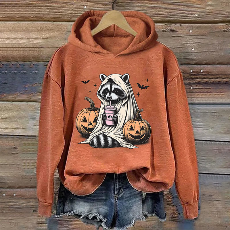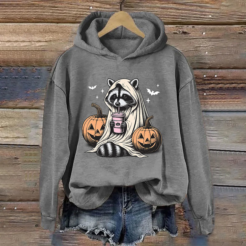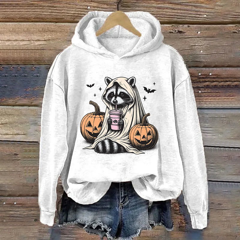 Dashingsoul Cute Halloween Raccoon Ghost Print Casual Long Sleeve Hoodie