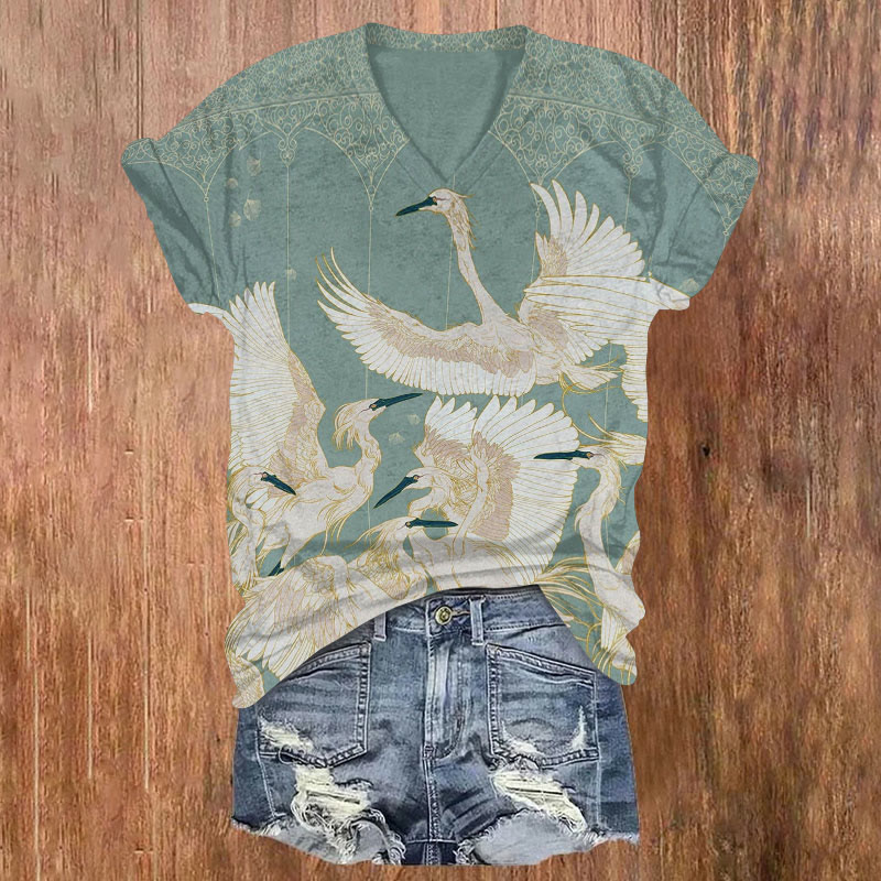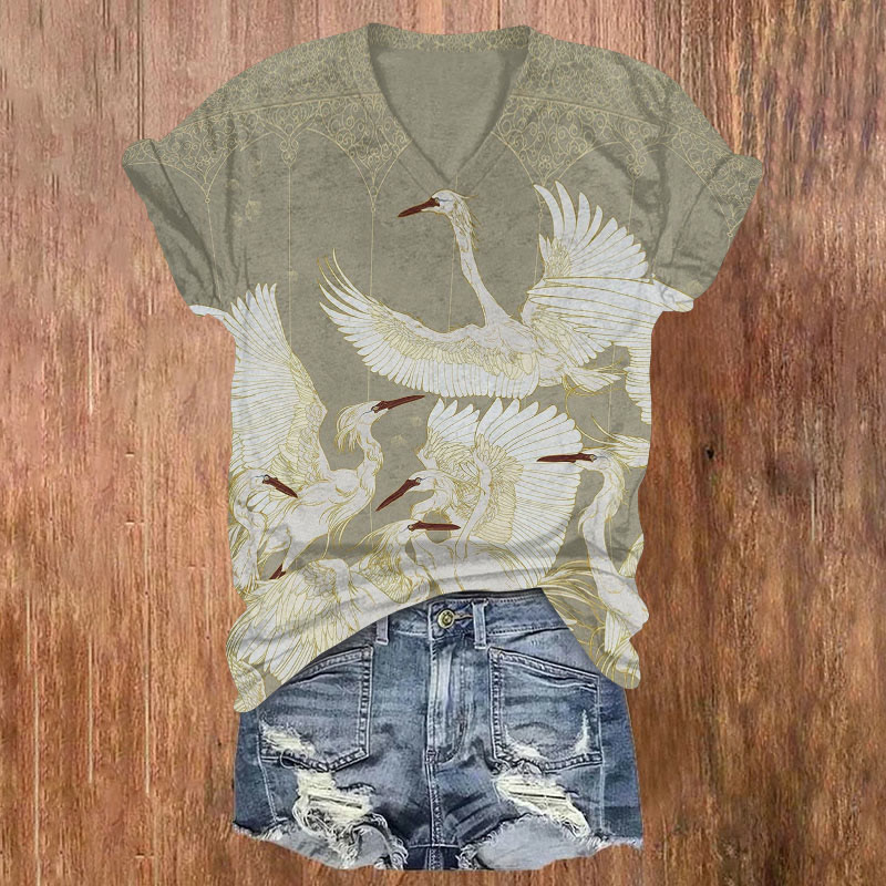 Dashingsoul Dancing Cranes Print Casual V-neck Short-sleeved T-shirt