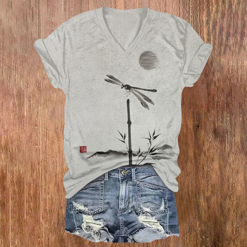 Dashingsoul Dragonfly Bamboo Ink Painting Japanese Art Print V-neck T-shirt