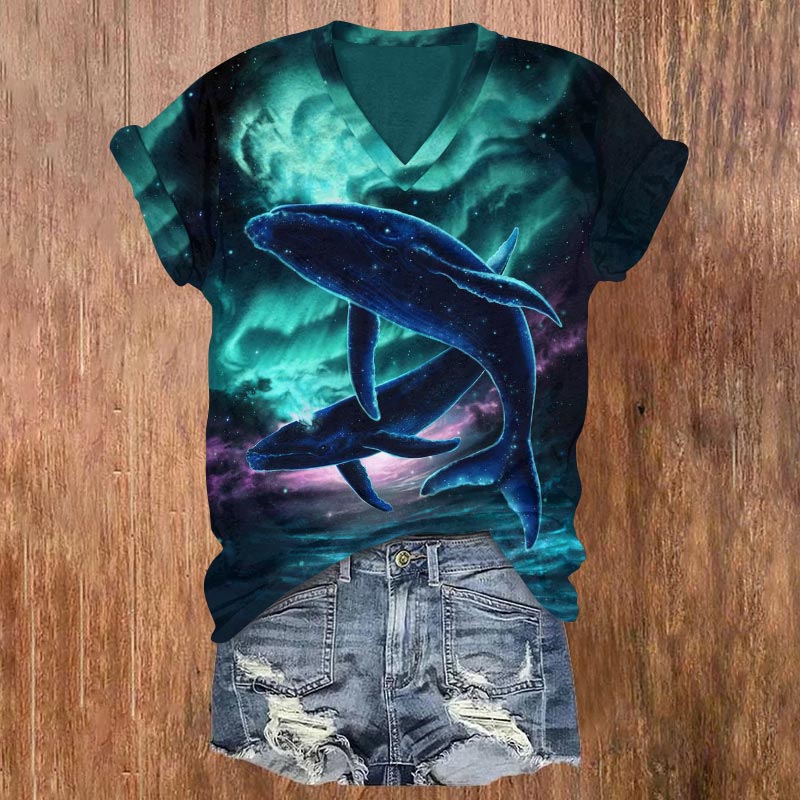 Dashingsoul Fantasy Aurora Starry Sky Silhouette Whale Print V-neck T-shirt