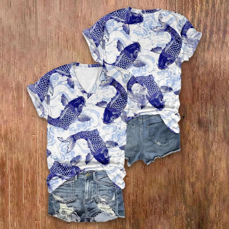 Dashingsoul Fortune Koi Oil Painting Art Print V-neck T-shirt