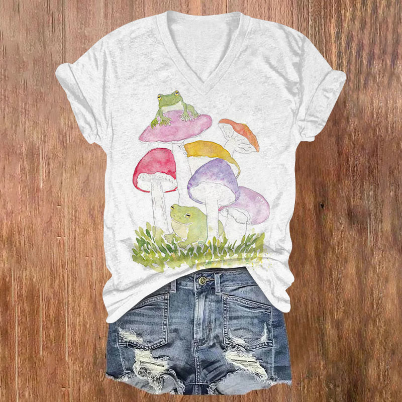 Dashingsoul Frog In The Magical Mushroom Garden Watercolor Painting Art Print V-neck T-shirt