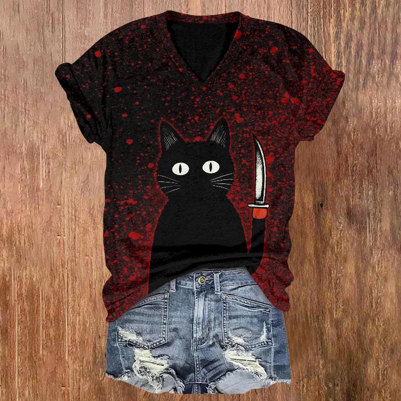 Dashingsoul Funny Murderous Black Cat With Knife Halloween Print Casual V-neck Short-sleeved T-shirt