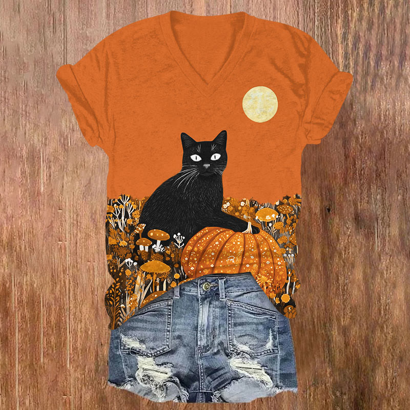 Halloween Cat & Pumpkings Print V-neck T-shirt