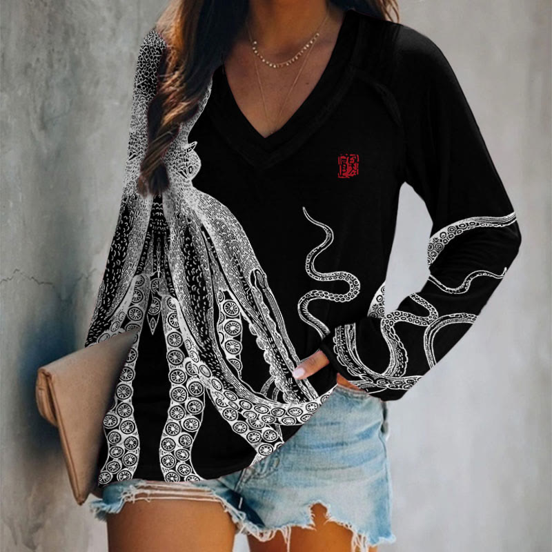 Dashingsoul Japanese Art Octopus And Crab Print Long Sleeve T-shirt