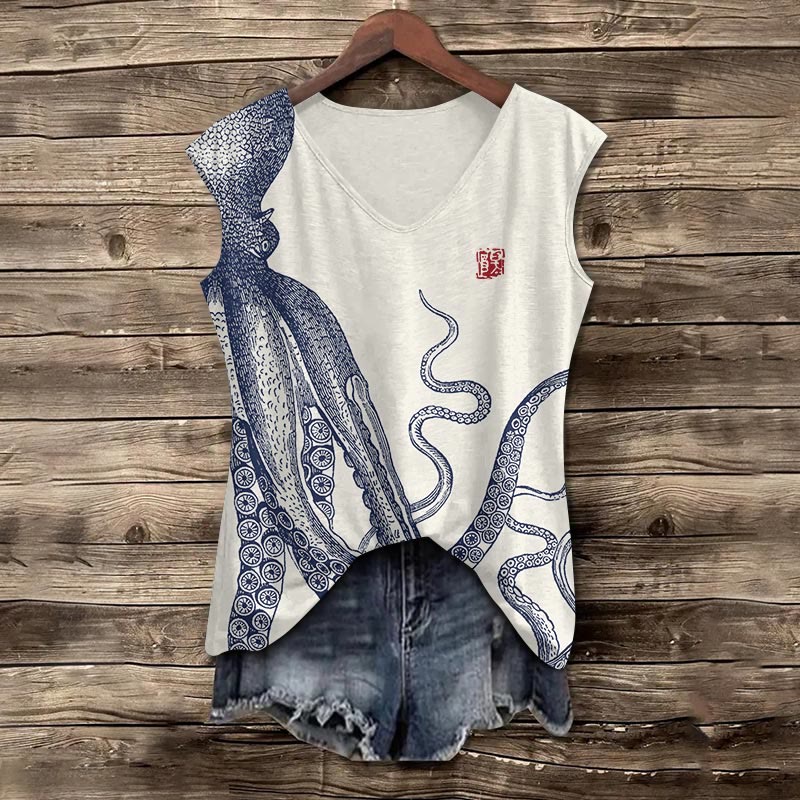 Japanese Art Octopus Print V-neck Tank Top