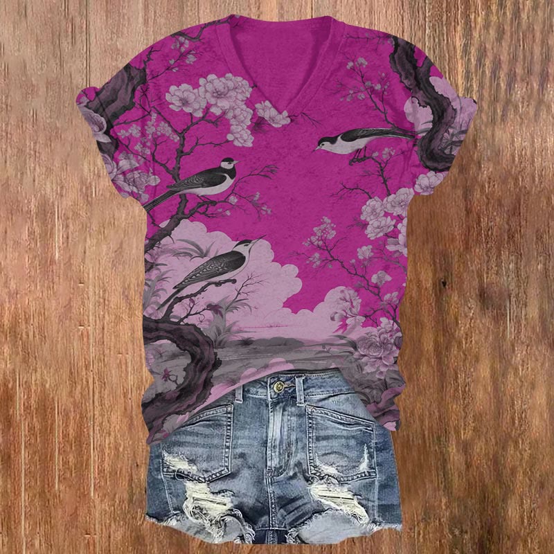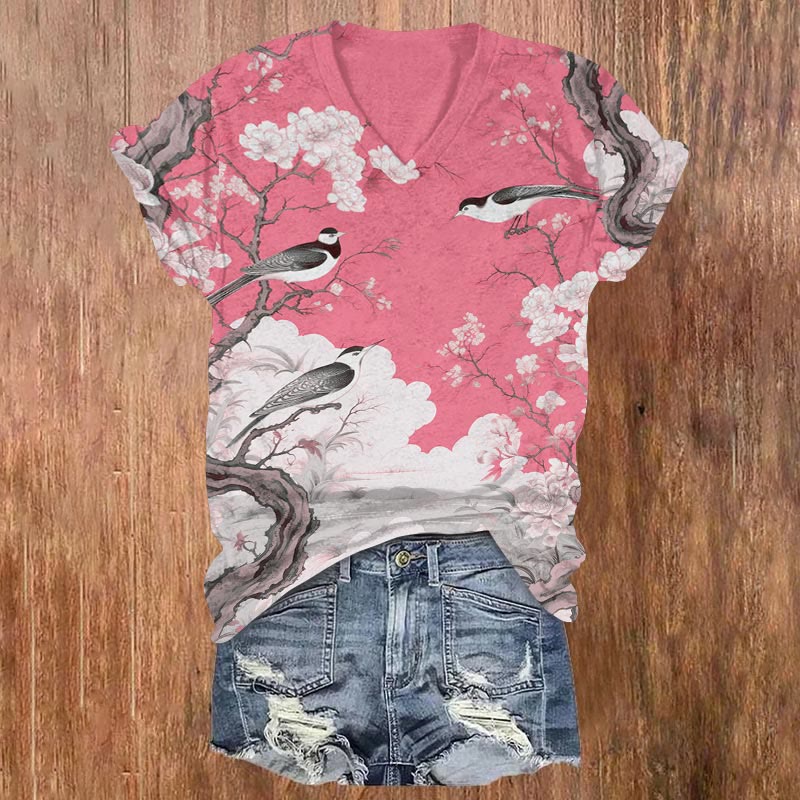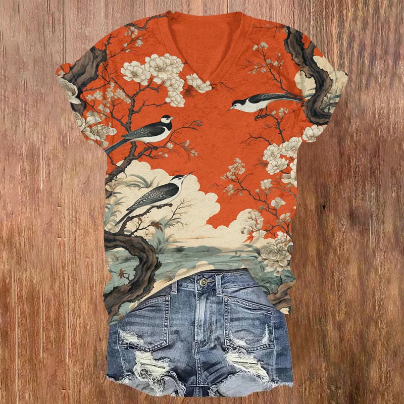Dashingsoul Japanese Flower And Bird Painting Art Print Casual V-neck T-shirt
