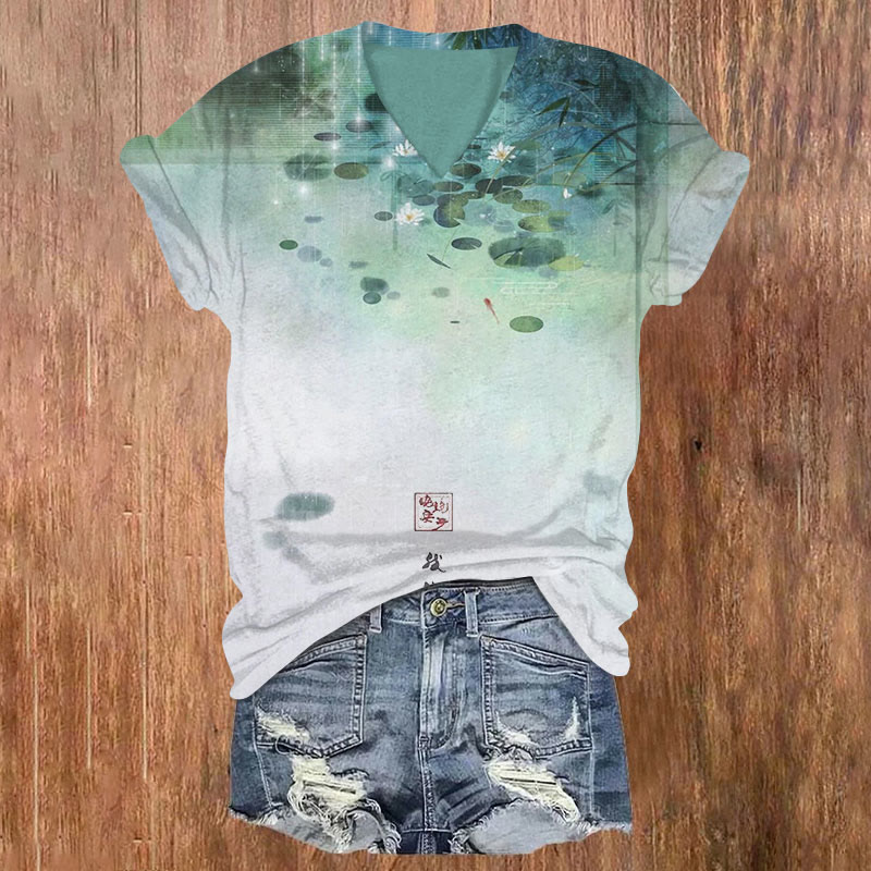 Dashingsoul Japanese Goldfish In Lotus Pond Contrasting Colors Print V-neck Short-sleeved T-shirt
