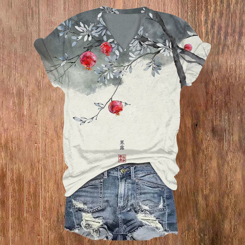 Dashingsoul Japanese Ink Pomegranate Contrasting Color Print V-neck Short-sleeved T-shirt