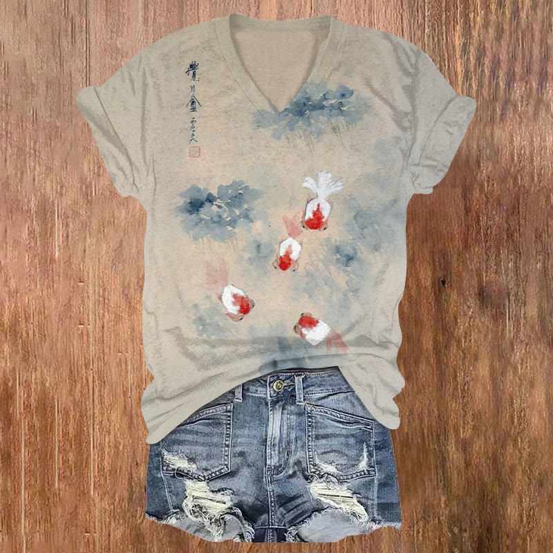 Dashingsoul Japanese Style Goldfish Watercolor Sfumato Print V-neck T-shirt