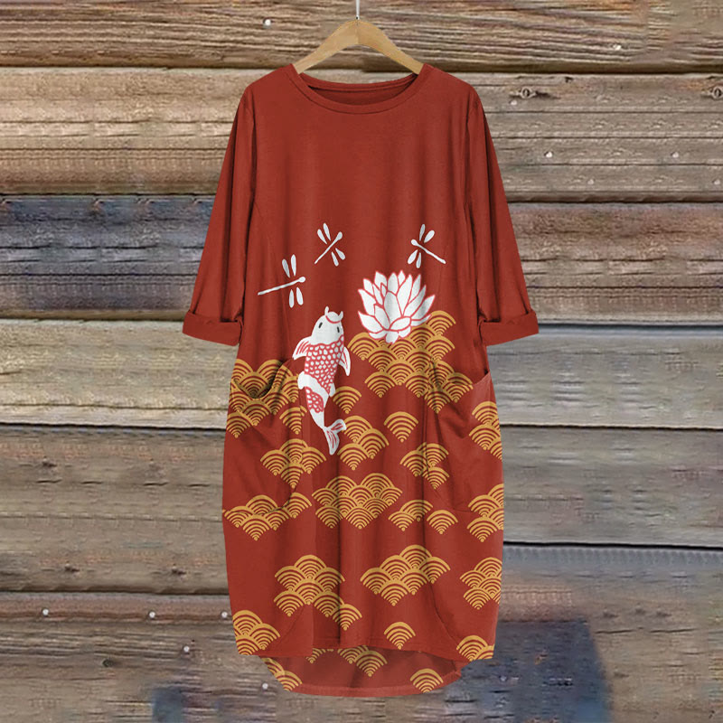 Japanese Style Koi Fish Dragonfly Wave Art Print Crew Neck Dress