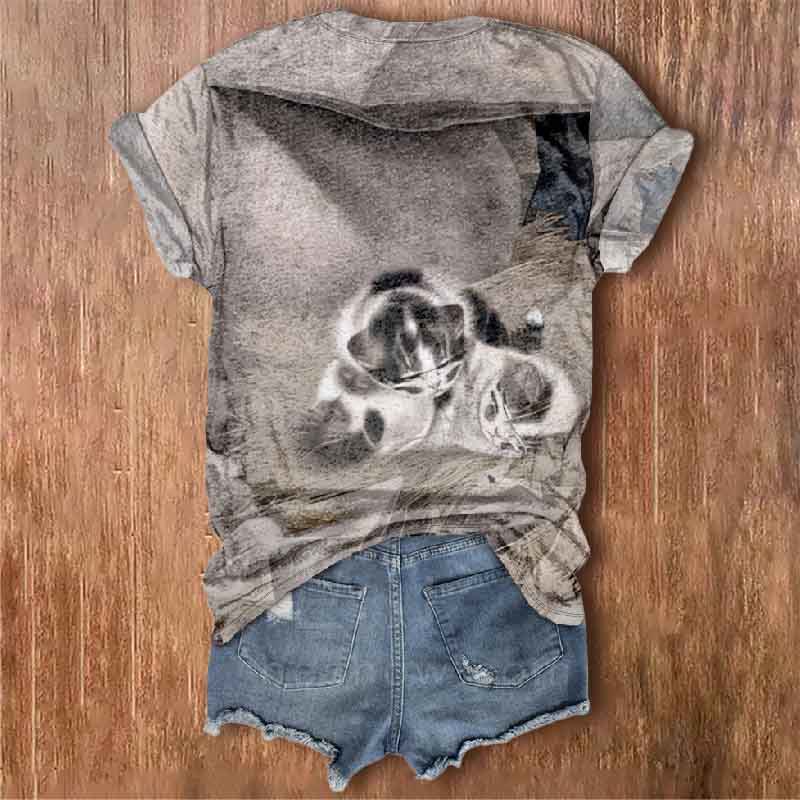 Dashingsoul Japanese Style Vintage Abstract Cat Print V-neck T-shirt