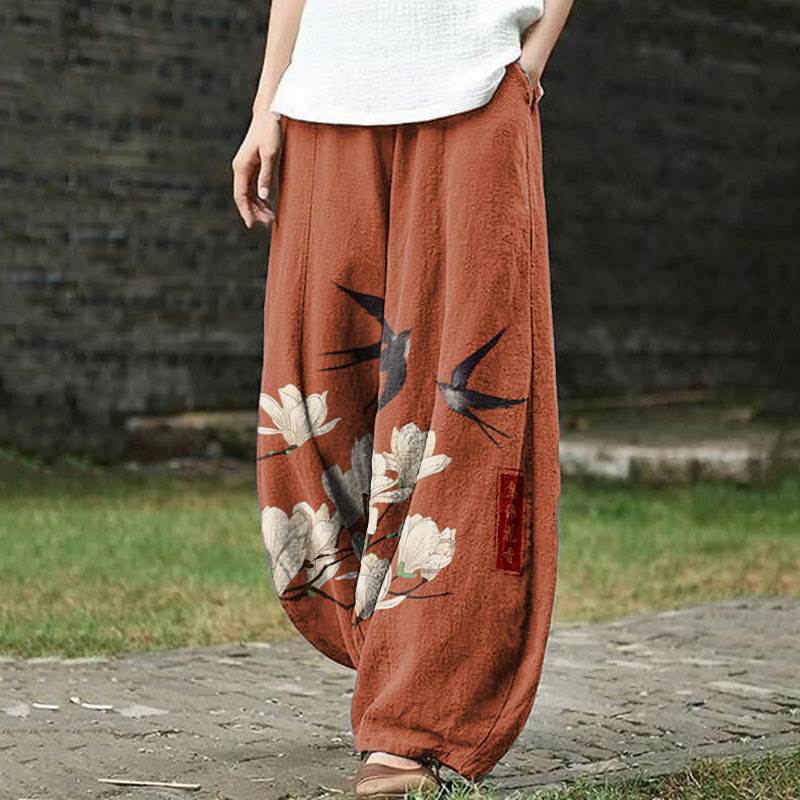 Japanese Vintage Swallow & Pear Blossom Art Print Casual Pants