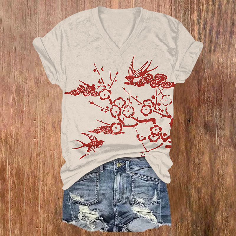 Japanese White Plum Blossoms And Sun Swallowtailprint V-neck T-shirt