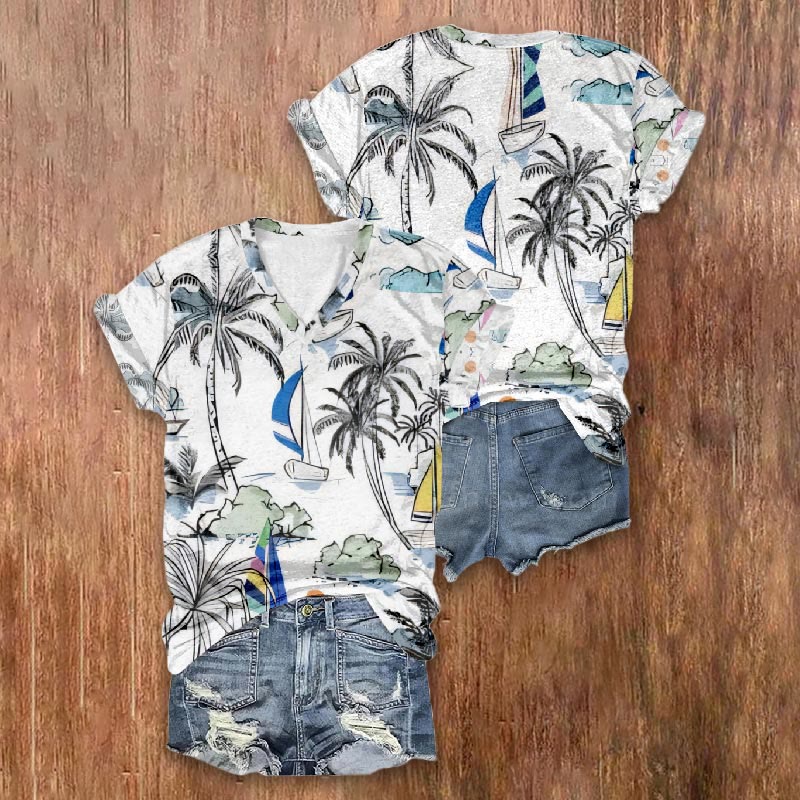 Dashingsoul Leisure View Upon The Sea Print V-neck T-shirt