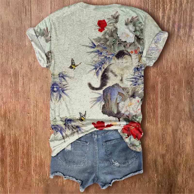 Dashingsoul Lovely Cat Watching Bees Collecting Honey Print V-neck T-shirt