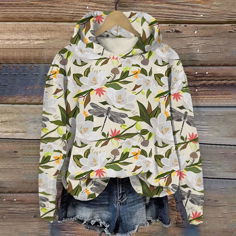 Dashingsoul Magnolia Flowers And Dragonfly Art Print Casual Long Sleeve Hoodie