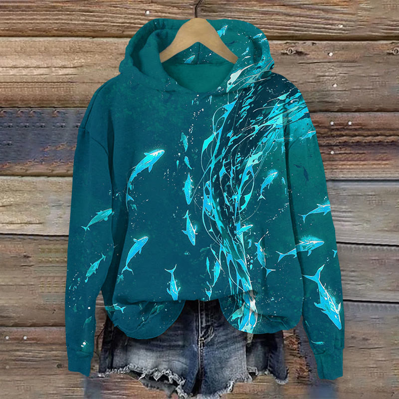 Ocean School Of Fishes Print Long Sleeve Hoodie