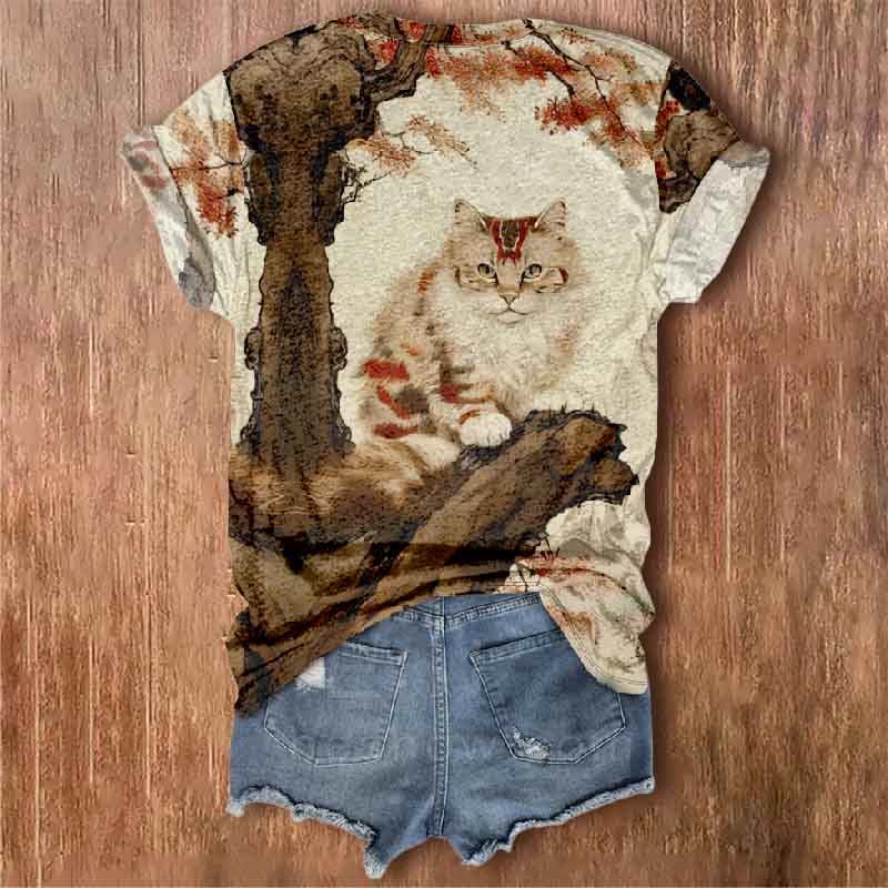 Dashingsoul Oil Painting Staring Cat On The Maple Tree Art Print V-neck T-shirt
