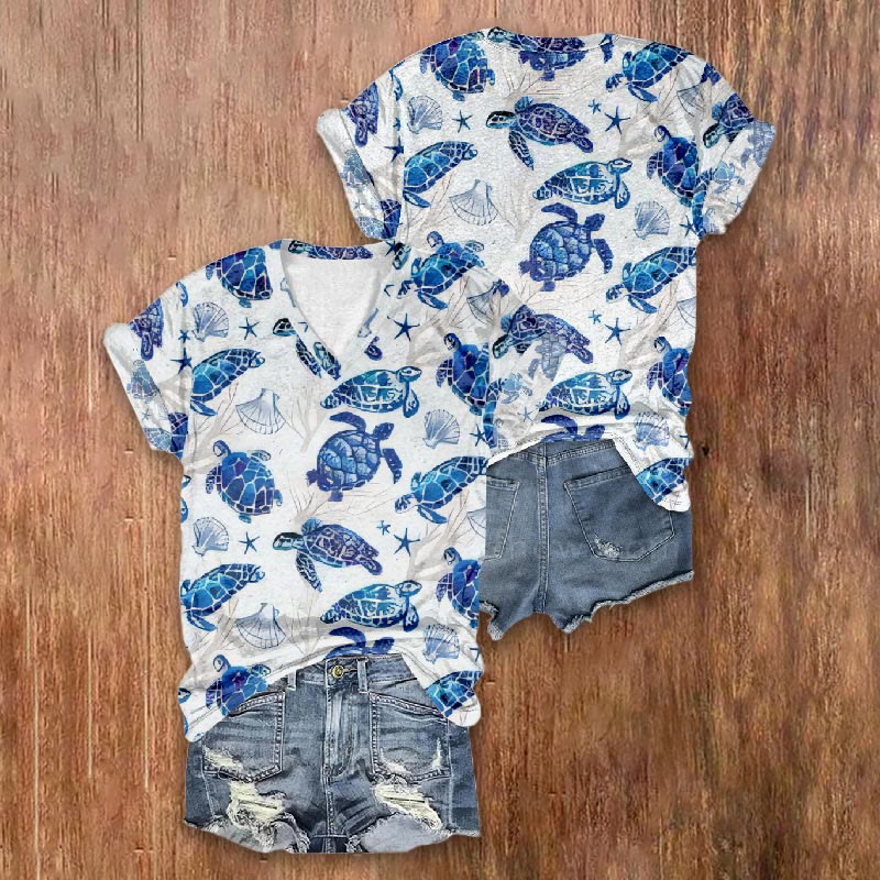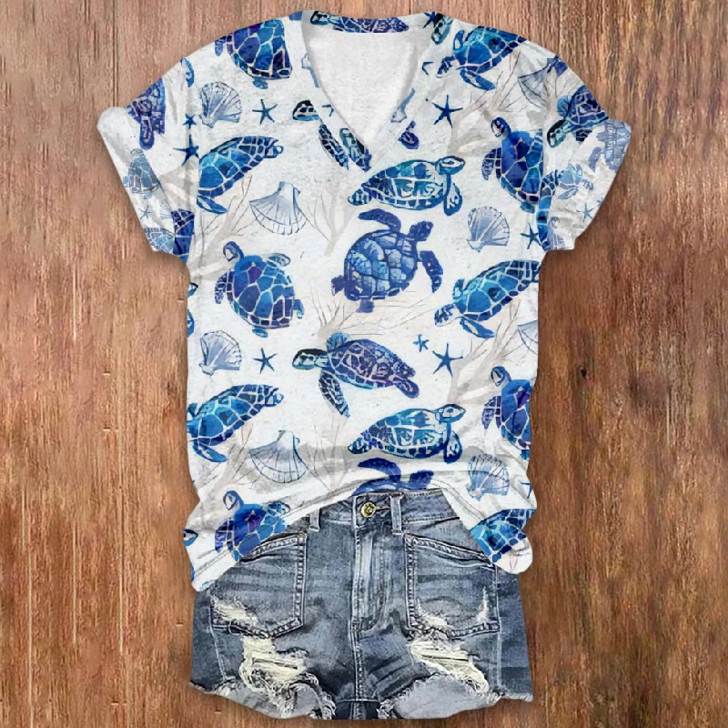 Dashingsoul Ombre Lovely Sea Turtles Casul Print V-neck Short Sleeve T-shirt