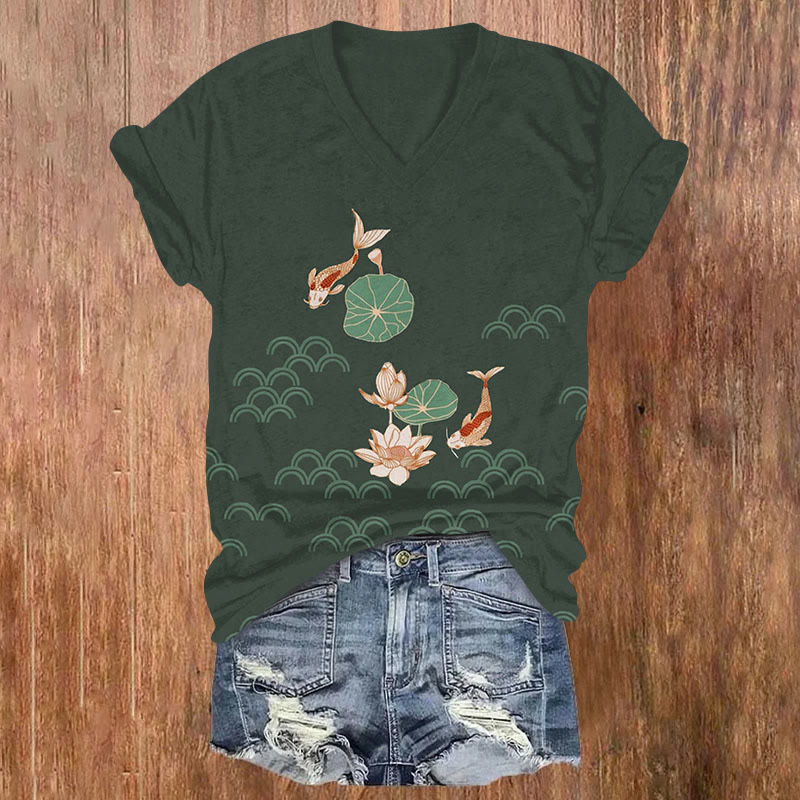 Retro Japanese Style Goldfish Lotus And Waves Simple Art Print T-shirt