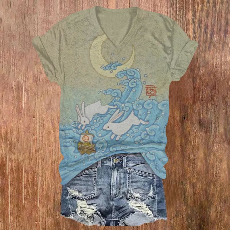 Dashingsoul Retro Waves And Rabbits Print V-neck Short-sleeved T-shirt