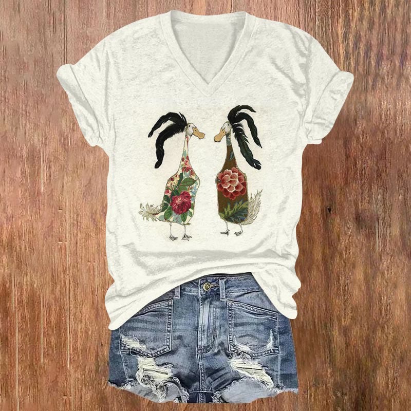 Dashingsoul Two Floral Ducks With Feathers On Their Heads Print V-neck T-shirt