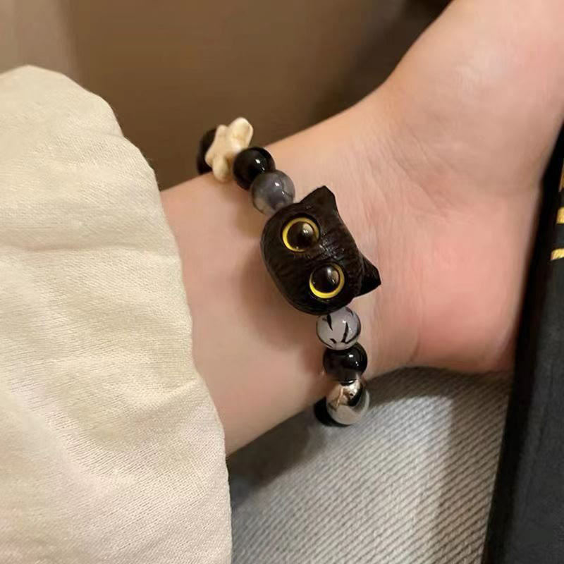 Vintage Cute Kitten Wooden Bracelet - Black - one size - image 2