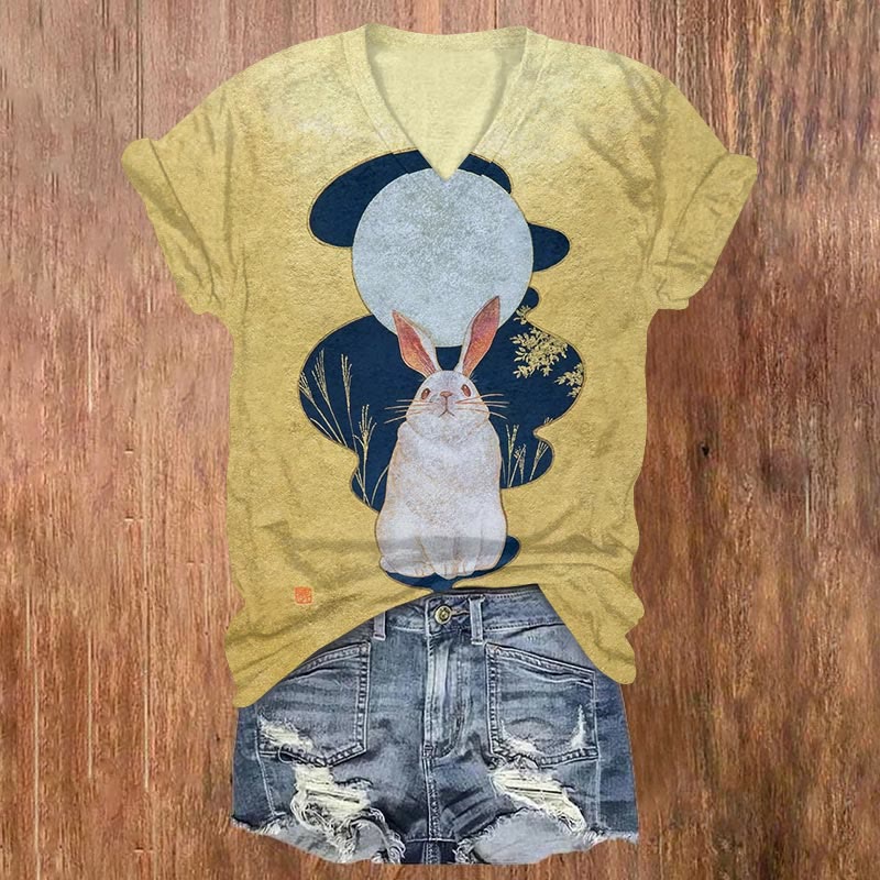 Dashingsoul Vintage Full Moon Rabbit Print V-neck Short-sleeved T-shirt