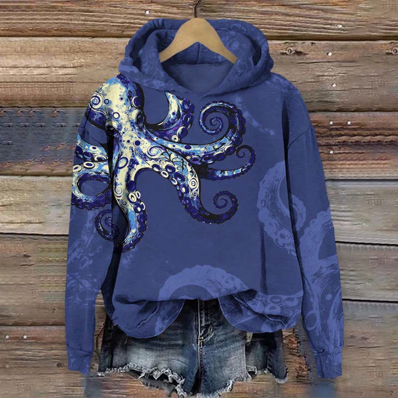 Vintage Style Octopus Art Print Long Sleeve Hoodie