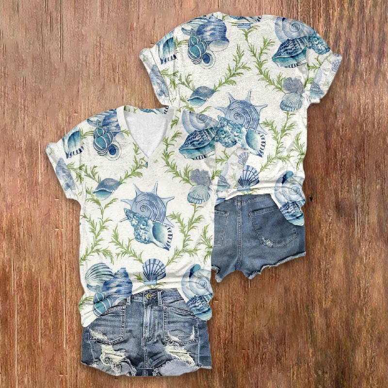 Dashingsoul Vivid Painting Conch And Shell Art Print V-neck T-shirt