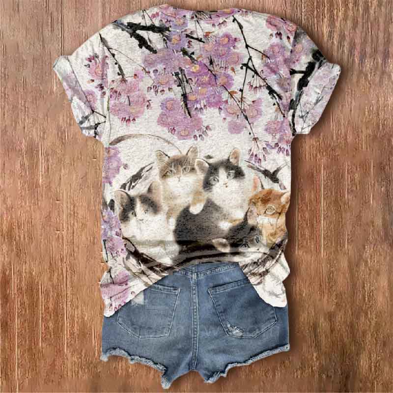 Dashingsoul Women's A Litter Of Kittens Surrounded By Sakura Print V-neck T-shirt