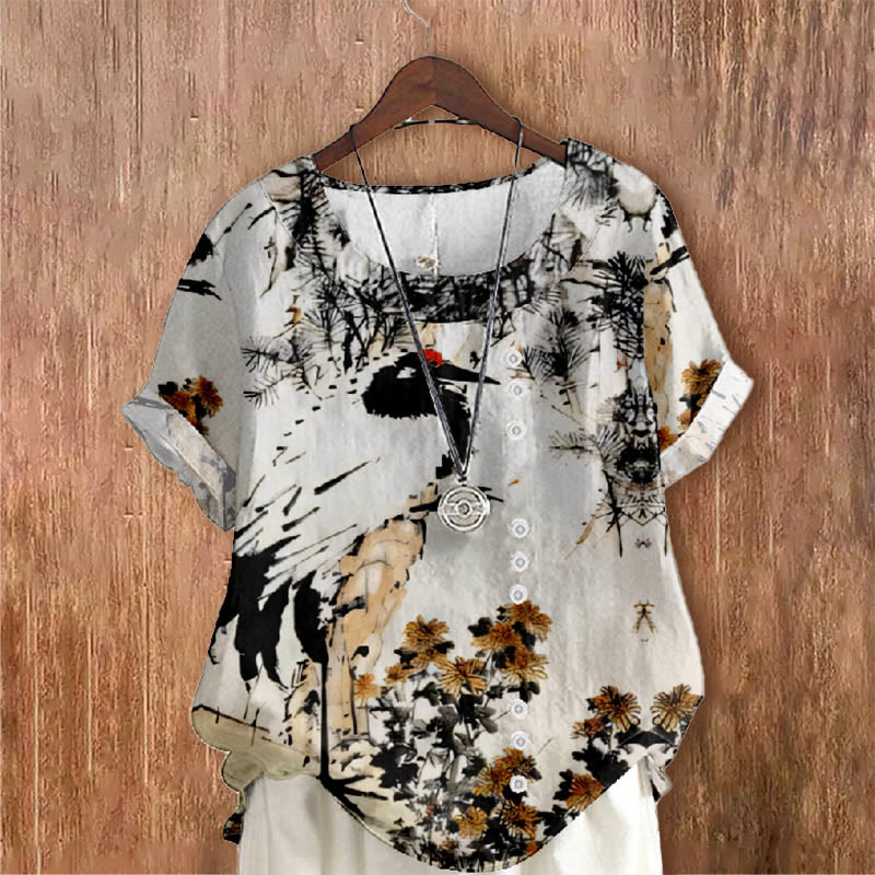 Dashingsoul Women's Abstract Ink Painting Cat Floral Art Print Blouse
