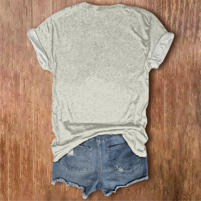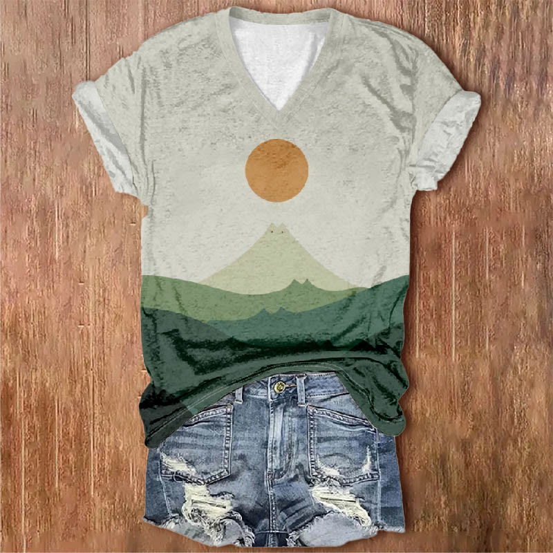 Dashingsoul Women's Abstract Mountain Cat Moon Print V-neck Short-sleeved T-shirt