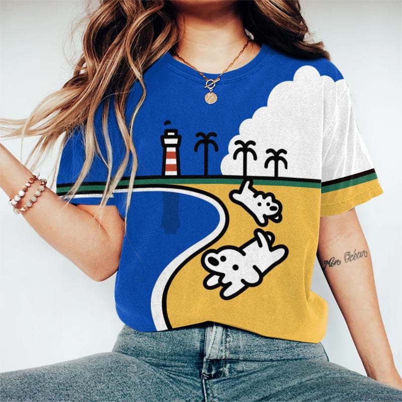 Dashingsoul Women's Casual Cute Seaside Dog Print Crewneck T-shirt
