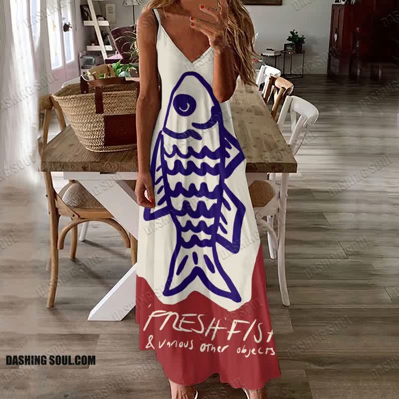 Women's Casual Silme Drawing Pnesh Fish Art Print Short Sleeve V-neck Suspenders Maxi Dress